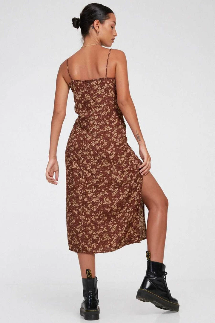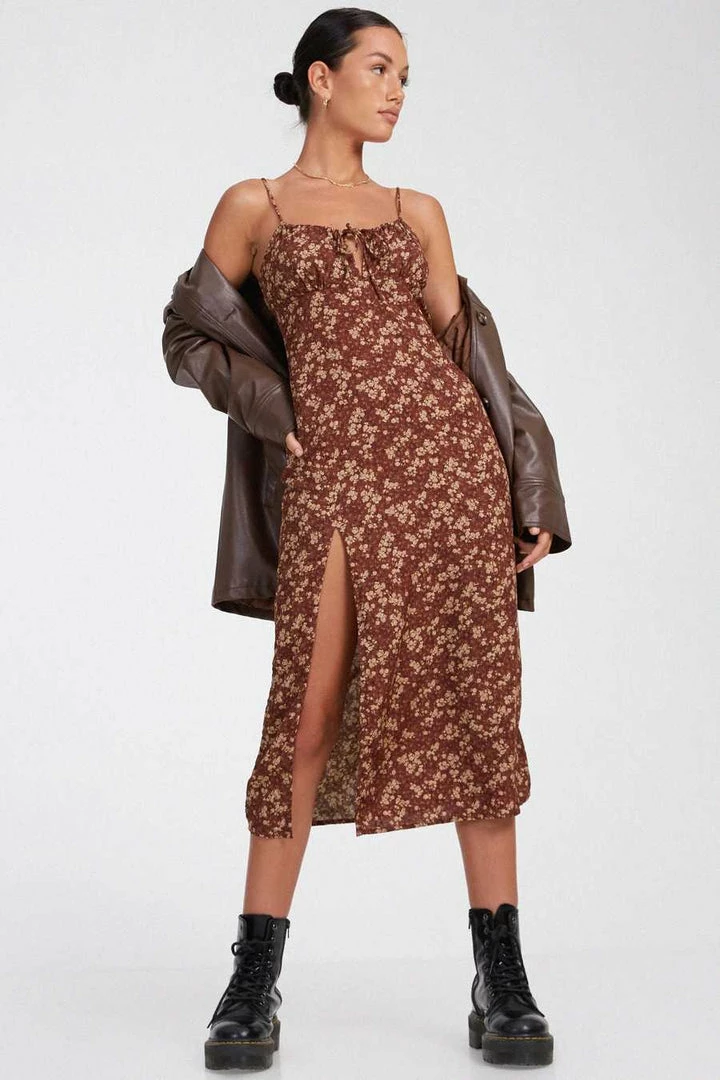 The Motel Cypress dress features a brown earthy floral print, midi length design with a cute side split, a square neckline with adjustable straps