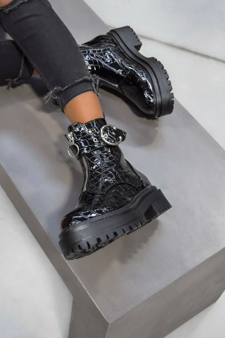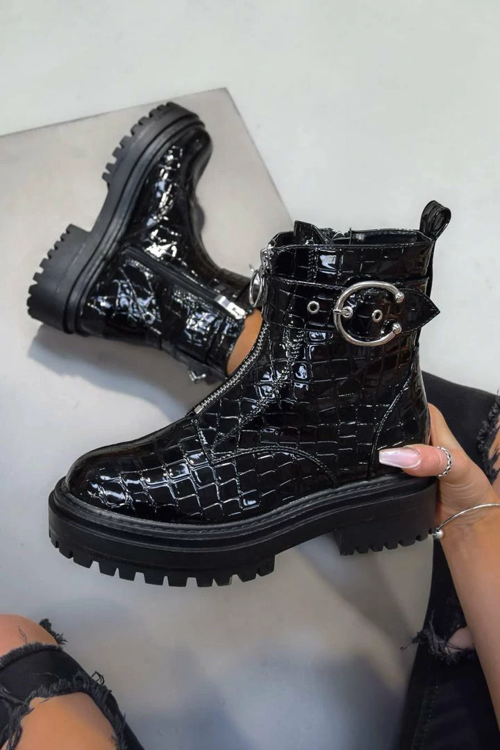 These new Baddies will be you new favourite this season, featuring a Croc Patent finish, zip up front detail with a metal side buckle & Chunky Sole.