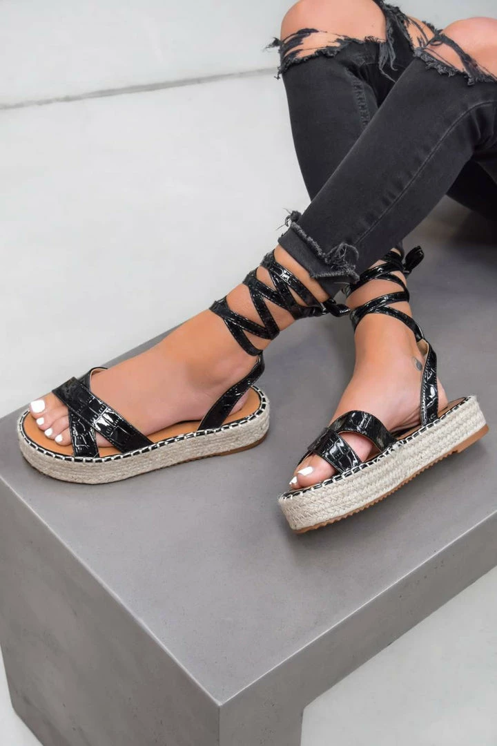 We’re loving these latest arrivals, our Elora cross over sandals features a chunky espadrille sole with a croc patent black upper strap with a tie up ankle fastening.