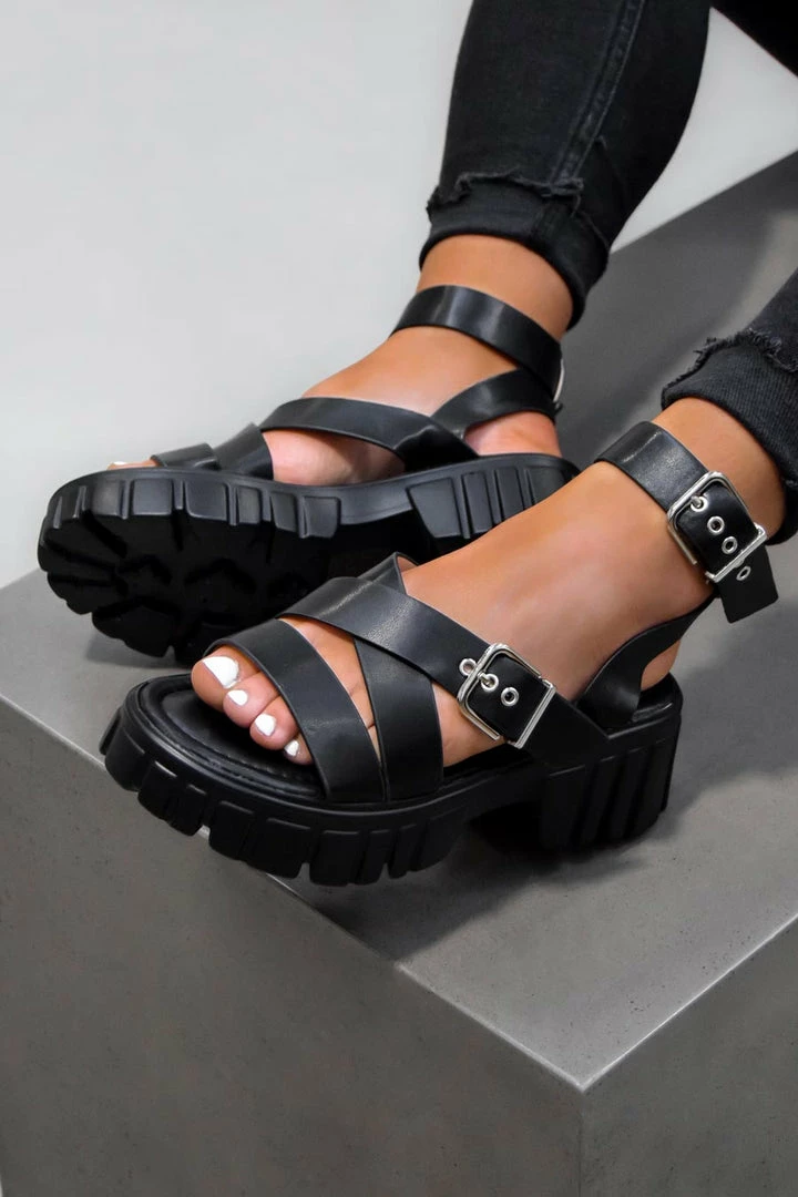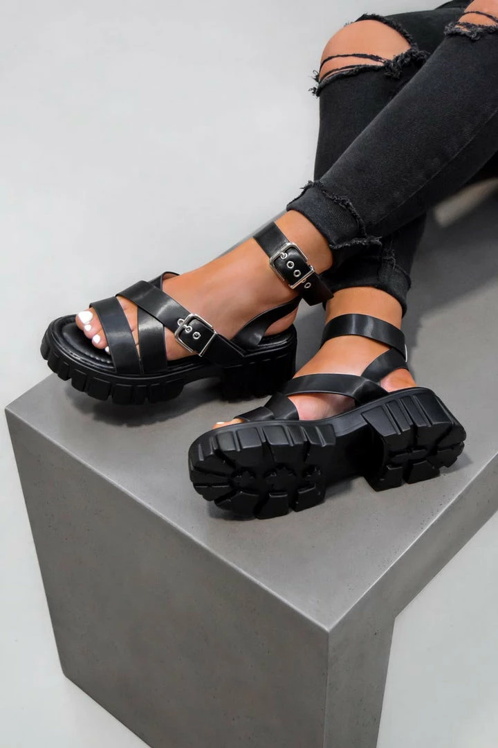 Our Emeila sandals feature a multiple strap front with buckle fastening, chunky sole and buckle ankle fastening. Â