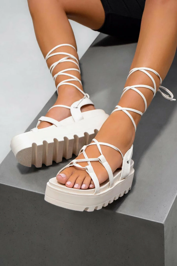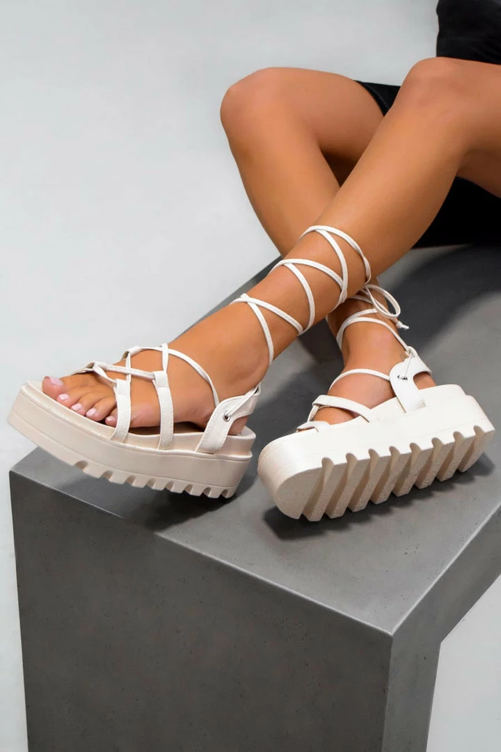 Our Isobel sandals featuring a caged gladiator style front, a chunky cleated sole and lace up fastening.