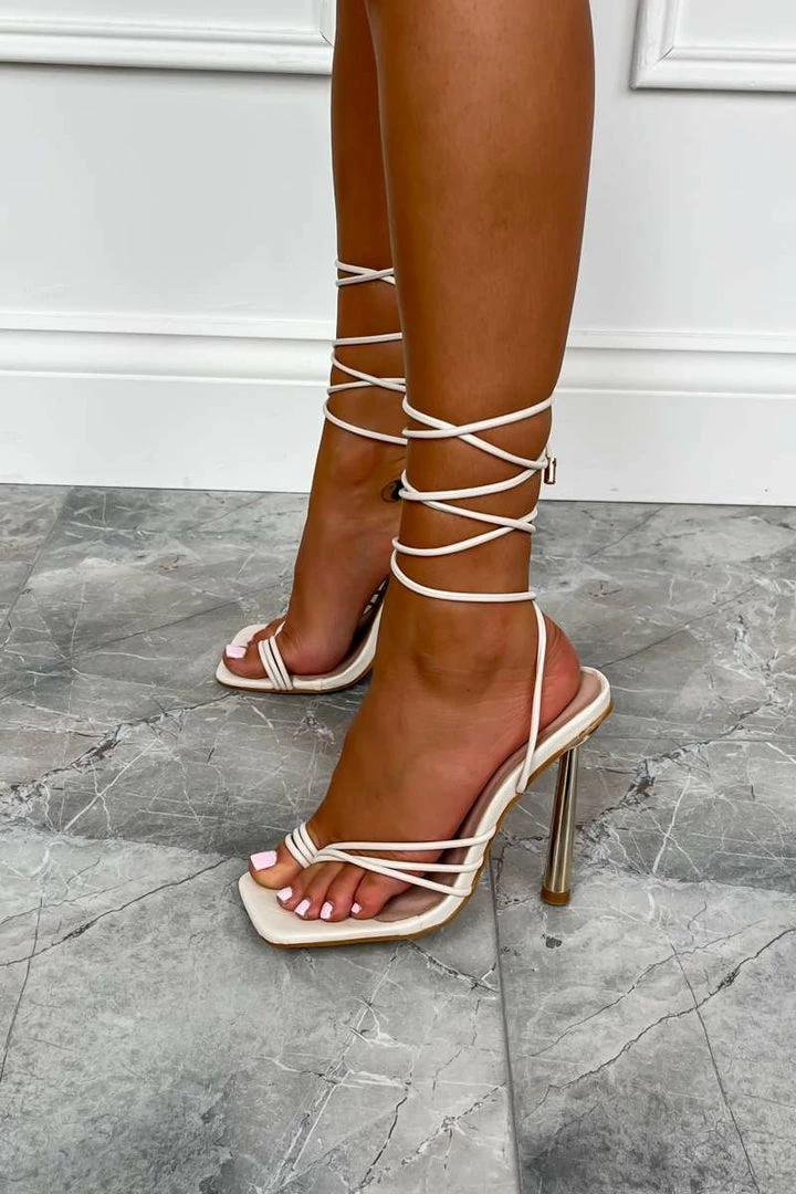 OurĀ Kacey heelsĀ featureĀ aĀ stiletto gold heel, strappy front design with toe-post detail and a wrap around lace up leg fasteningĀ