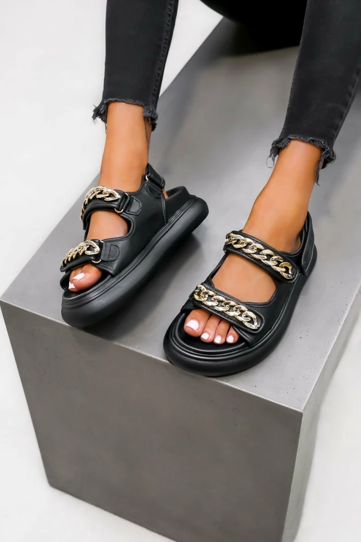 We’re loving these new arrivals, our ‘Kaila’ sandals are a definite Summer essential featuring a chunky sole design, gold chain detailing, multi-strap design and velcro fastening.