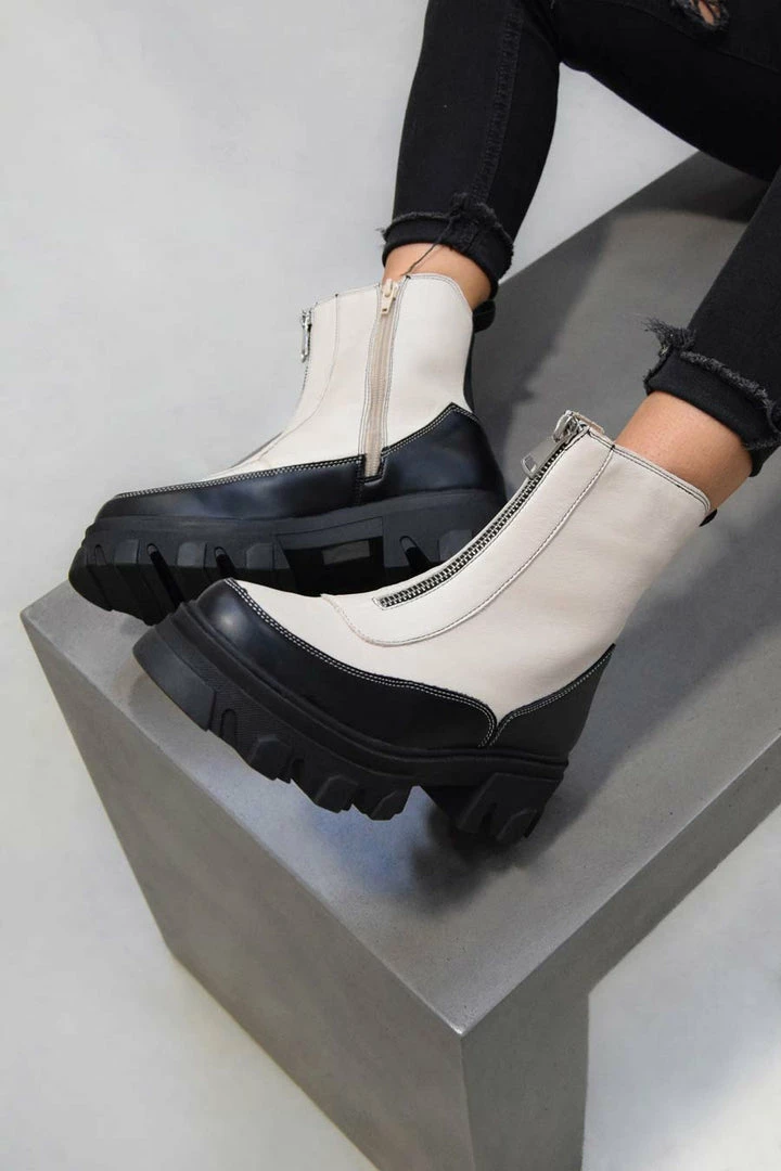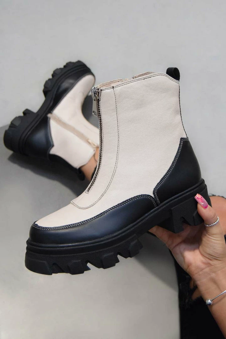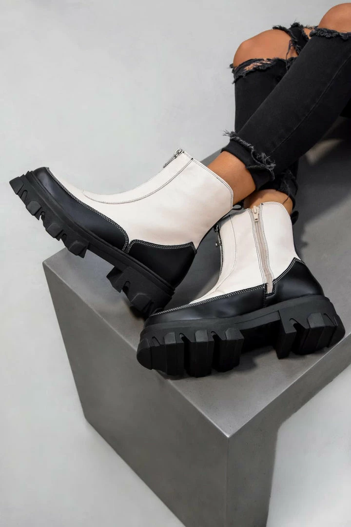 Our Kaya boots features a chunky platform sole, silver zip front detail panelling and contrast stitch.