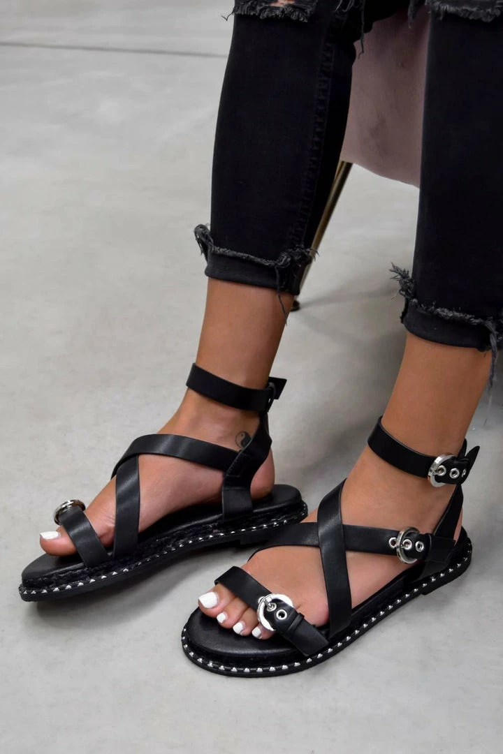 Our Kimmy sandals featuring a crossover front strap with multiple buckle fastenings.