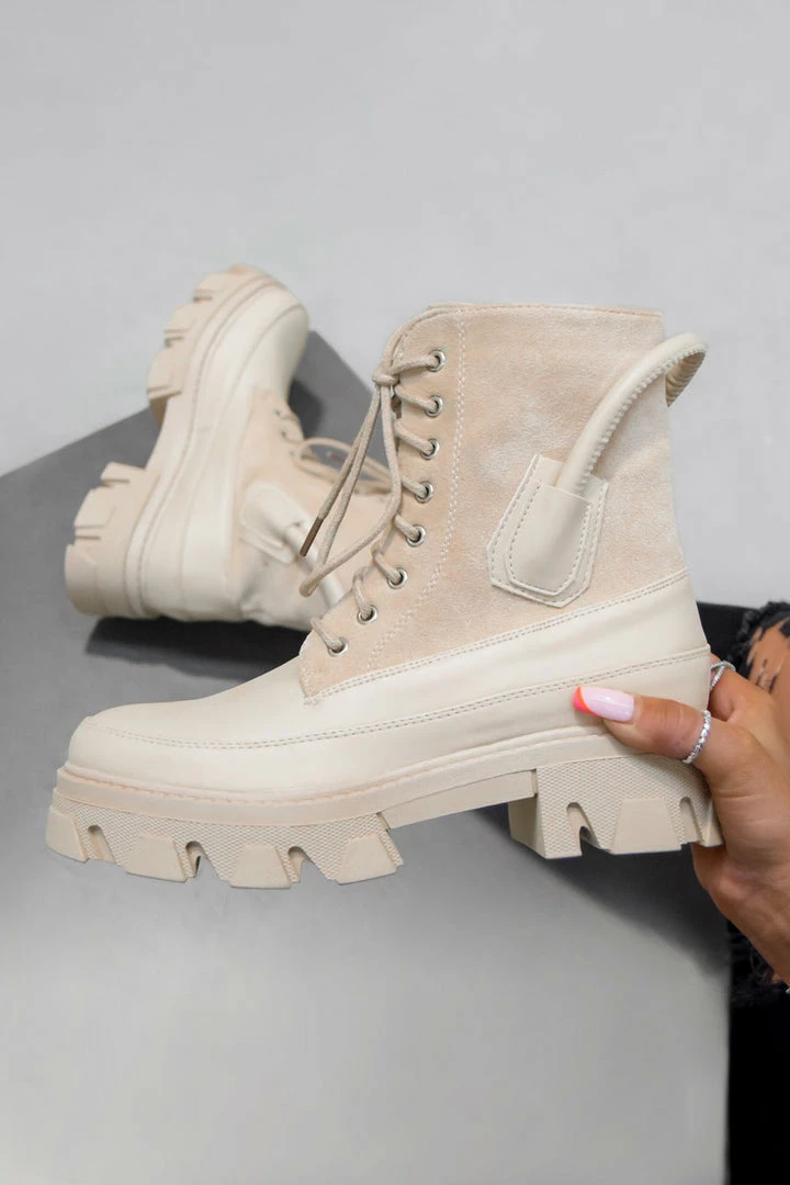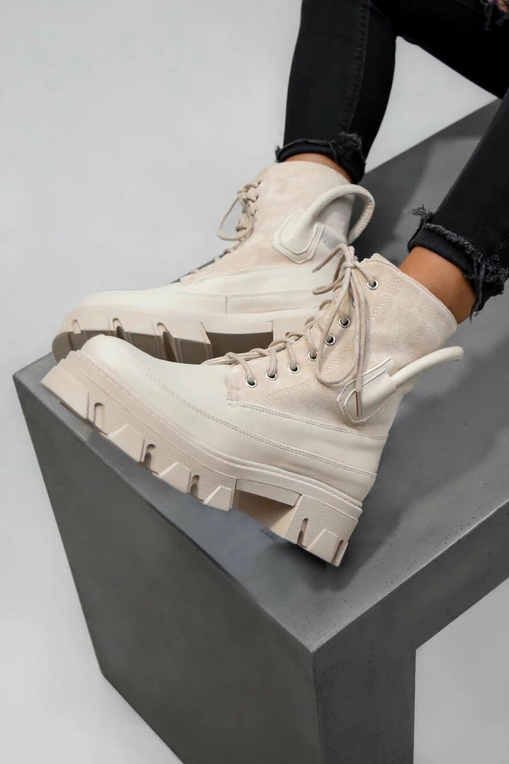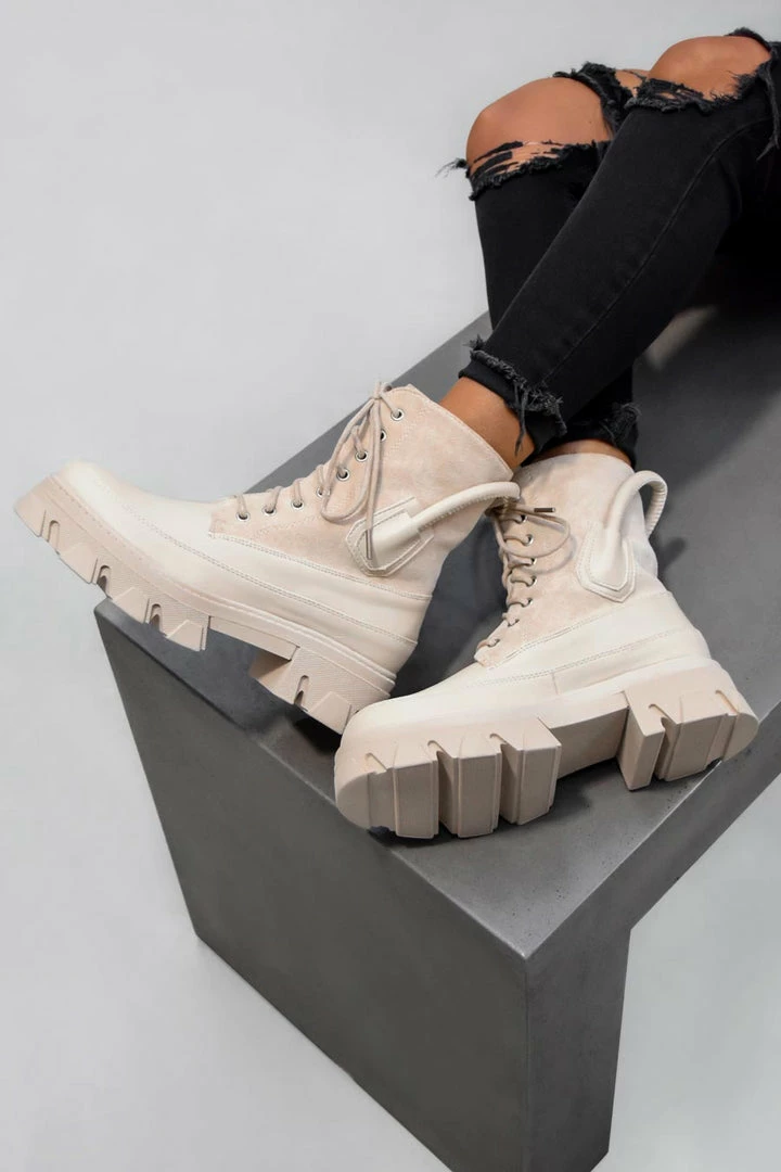 Our Peril boots feature a chunky cleated sole contrast faux suede upper with a lace up front.