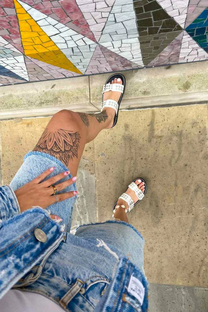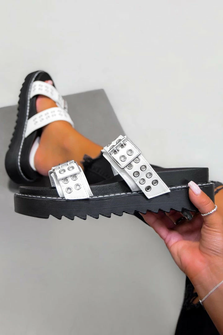 Our Revolt sandals featuring a chunky cleated sole design, multiple thick front straps, ankle buckle fastening with eyelet detail.