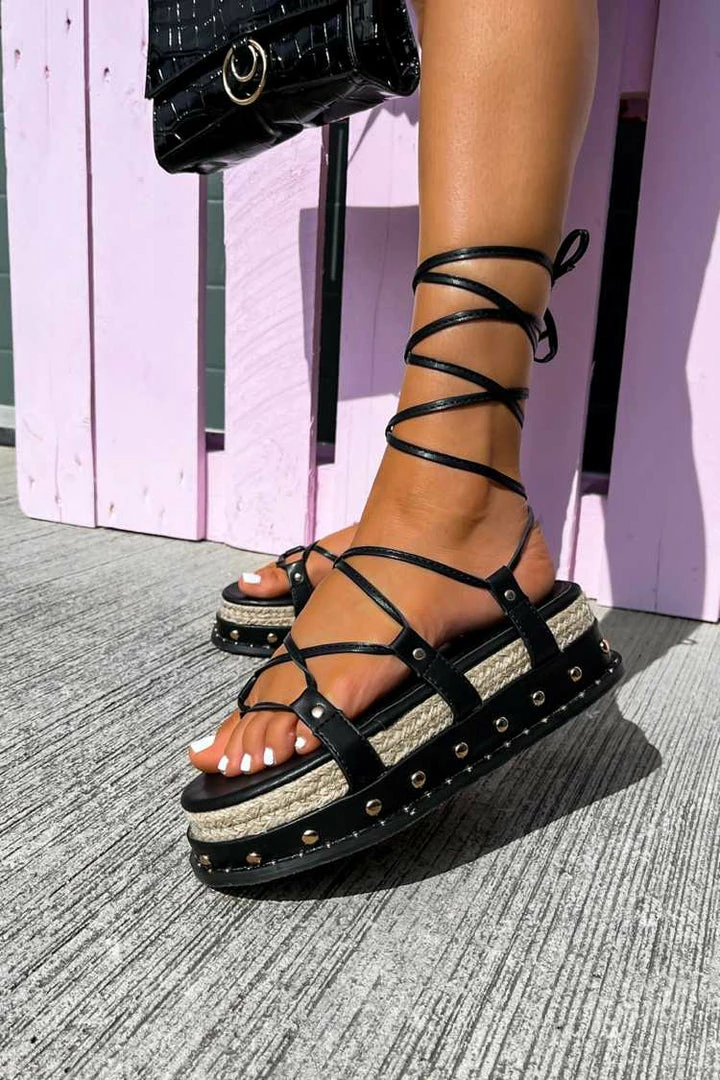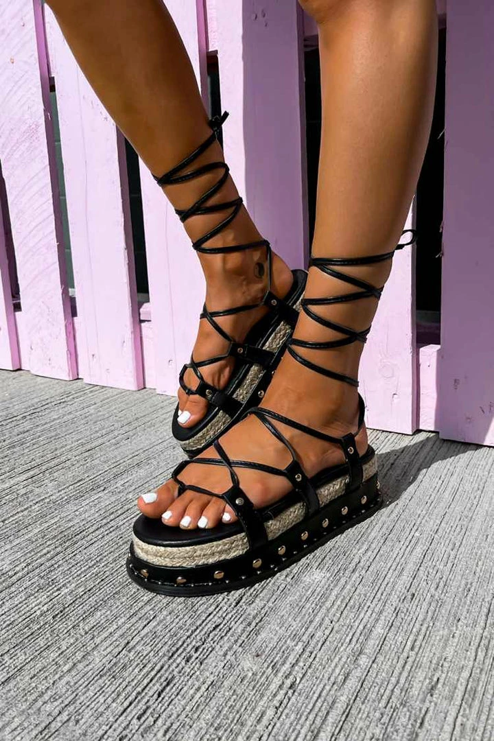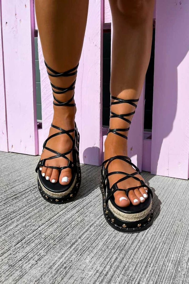 Our Roxi sandals feature a chunky flatform sole with gold stud detail and a lace-up wrap around the leg design.