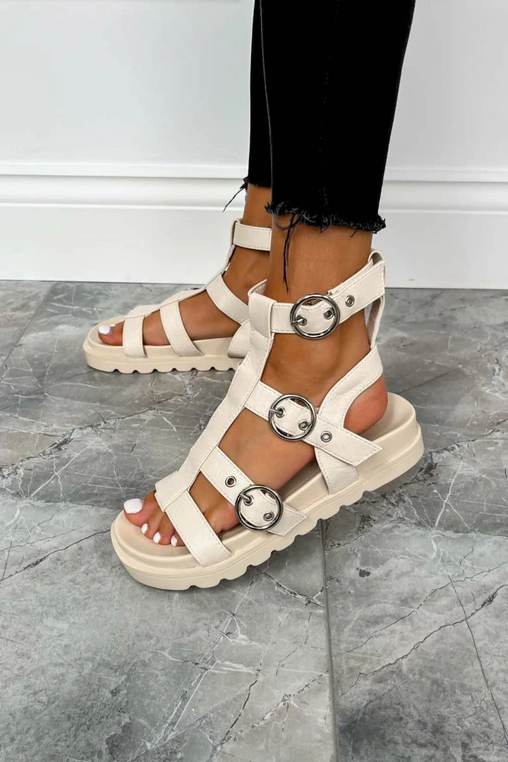 Our Delia sandals feature a multi-strap gladiator upper, silver buckle fastenings and chunky sole.