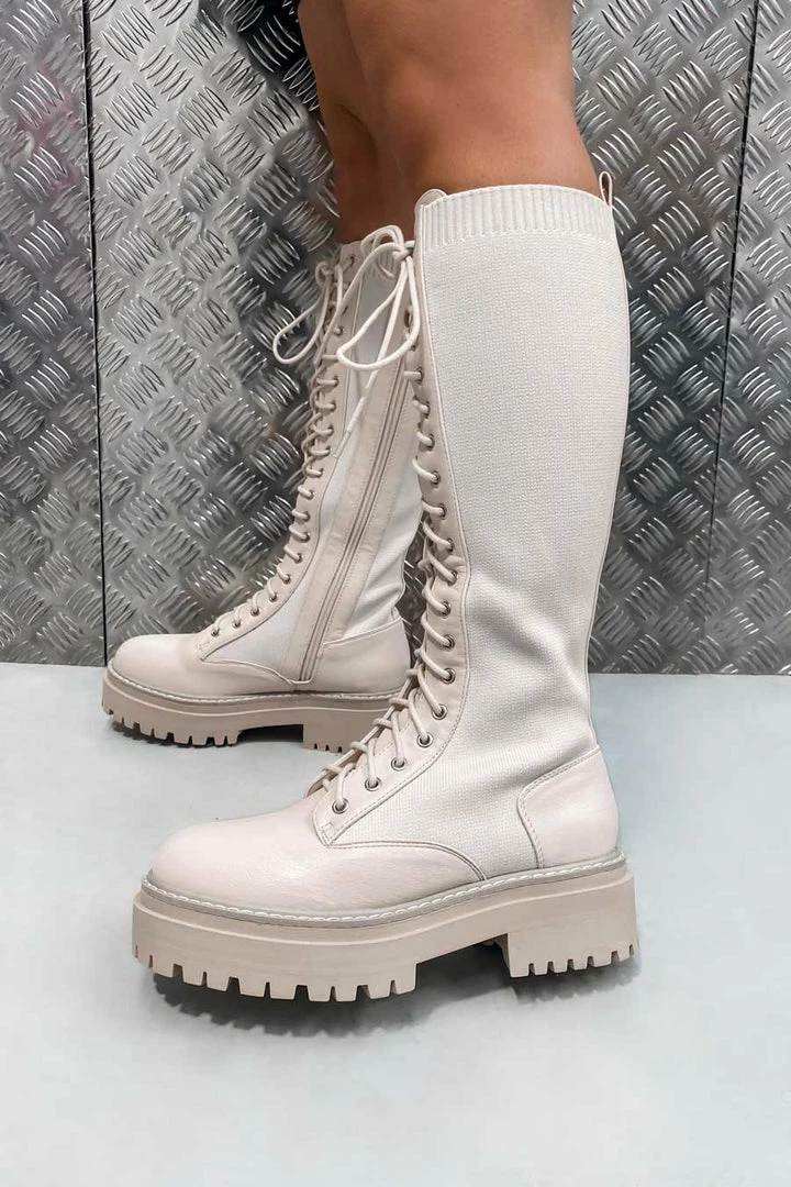 Our Destruction boots feature a lace up front, sock fit midi design with an inside zip and chunky cut out patterned sole.