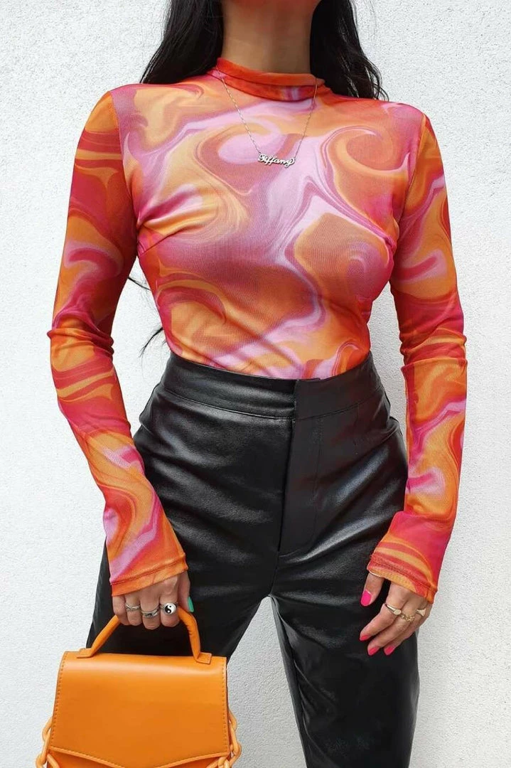 Update your wardrobe with this bodysuit, featuring a racer-cut, fully lined mesh bodysuit with abstract flocking design