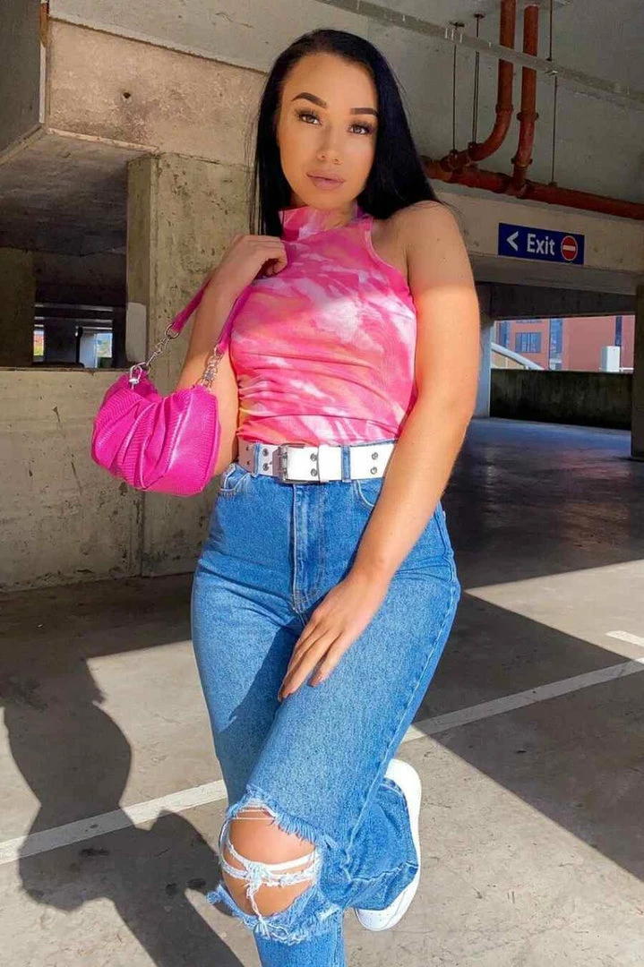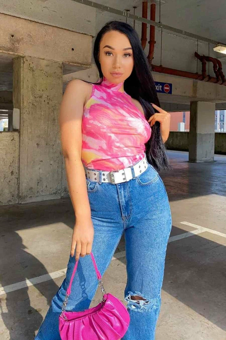 Update your wardrobe this season with this new arrival, featuring a high neck with a single pearlescent button neck-closure, mesh fabric in a bright pink / orange swirl print