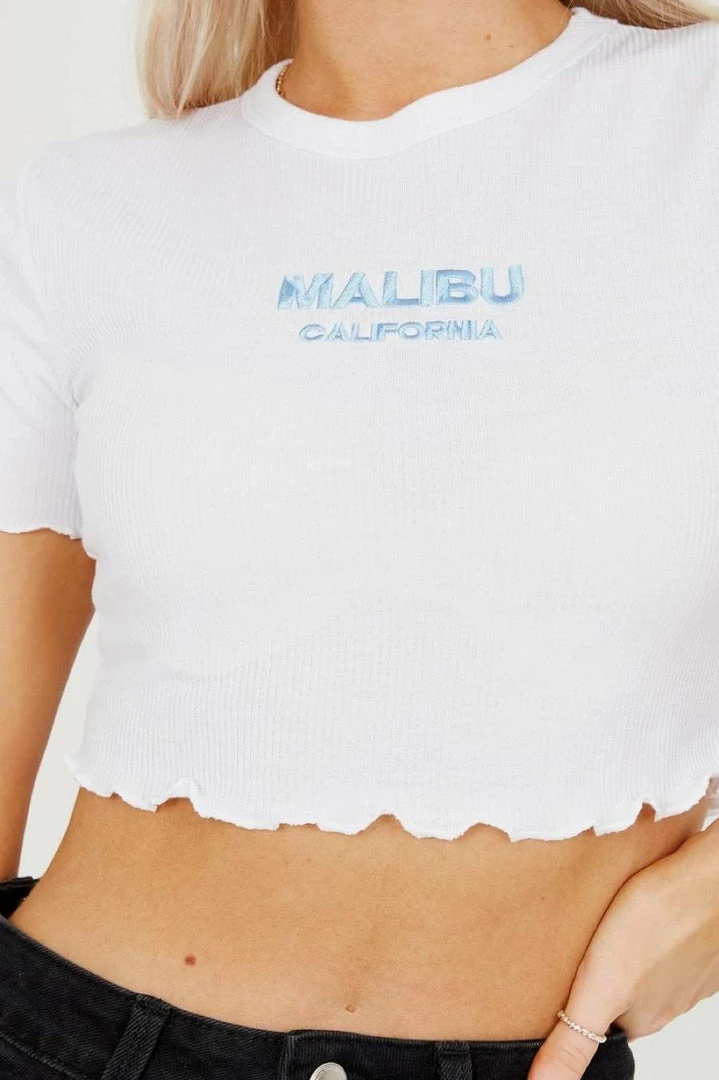 Every wardrobe needs its basics and this embroidered tee is an essential this season. Featuring a black ribbed fabric, short sleeves, Malibu embroidery and cropped fit, team it with black denim to complete this look.
